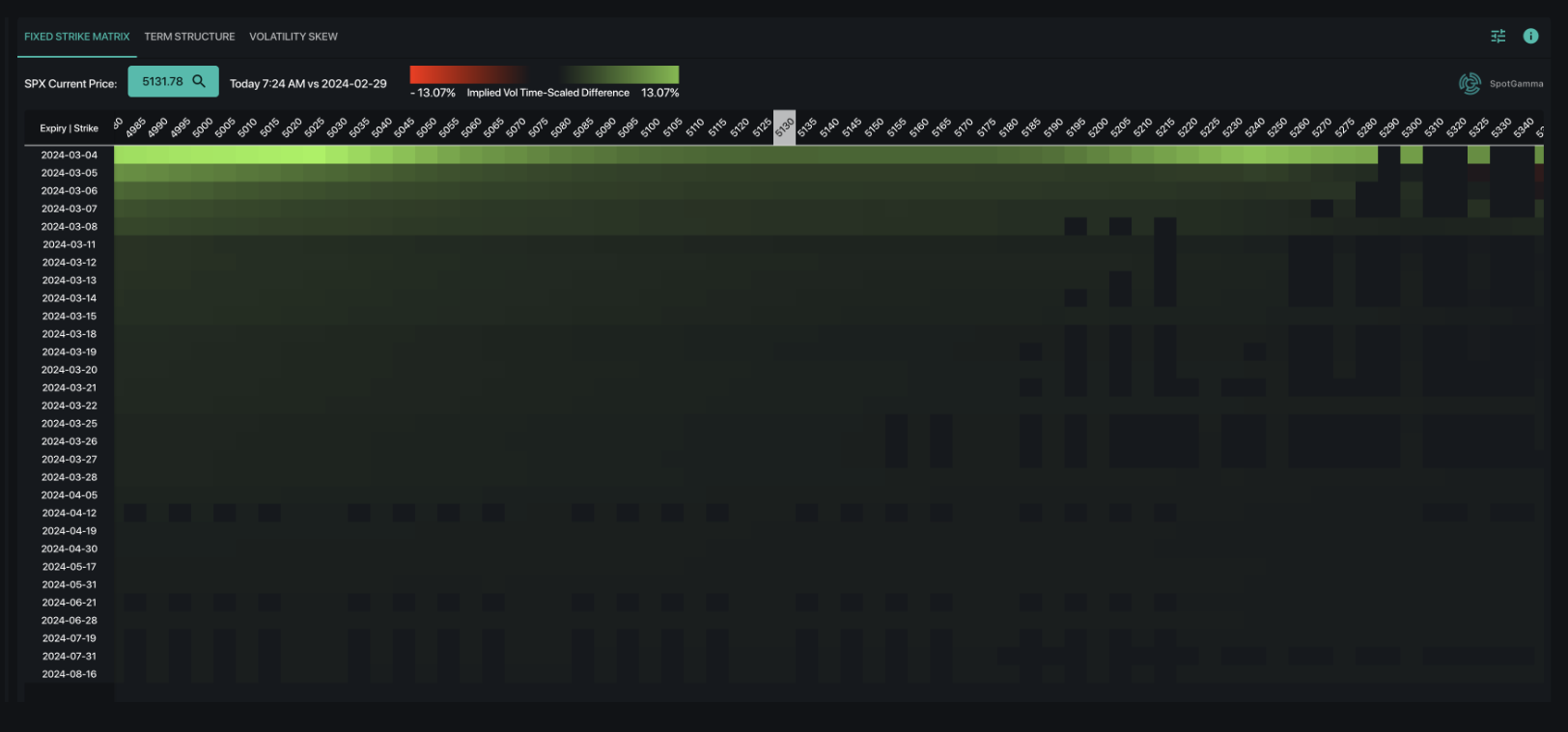 While that singular strike appears to have some short dated selling, longer dated S&P500 upside shows call buying. Shown here is our Fixed Strike Matrix for the SPX which compares IV for all strikes (x axis) across all expirations (y axis). This shows from Thursday’s close vs this morning and as you can see its a “sea of green”, which suggests that IV’s are up across the board. This is a sign of “stocks up, vol up”, which can occur during times of aggressive call buying.