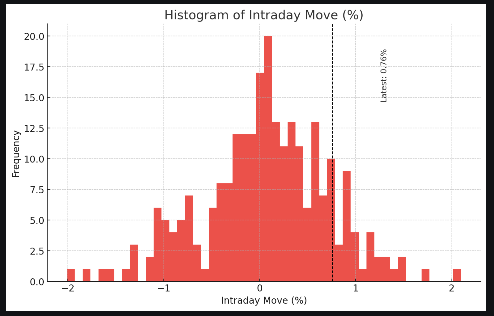 The S&P was up 76bps intraday, and 80 bps (Thurs. close to Fri close), which is a nice rally, but not a “door buster”, as you can see in the histogram of intraday SPX returns, below. This pales in comparison to the red-hot SMH (semi ETF), for example, which was up 4%.