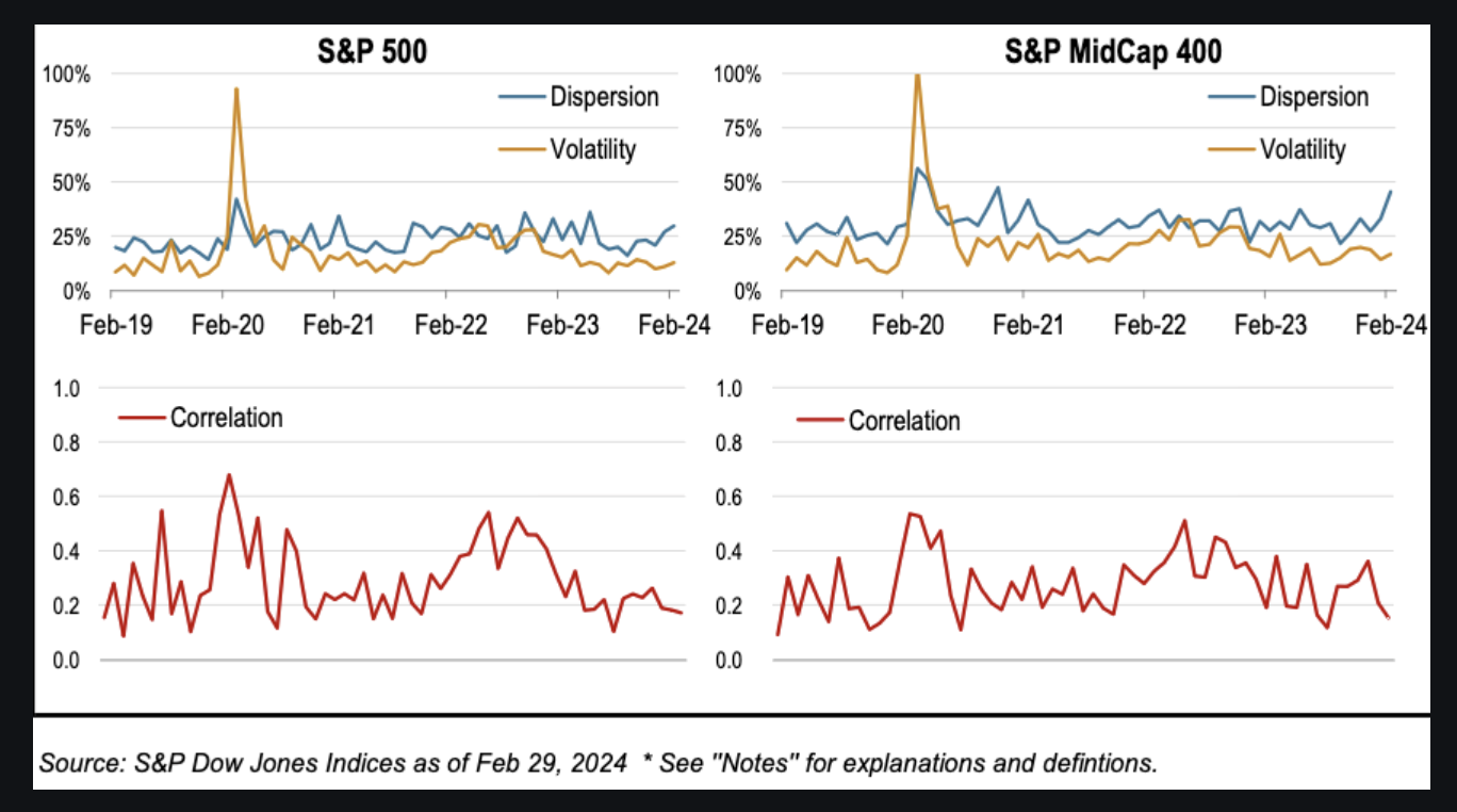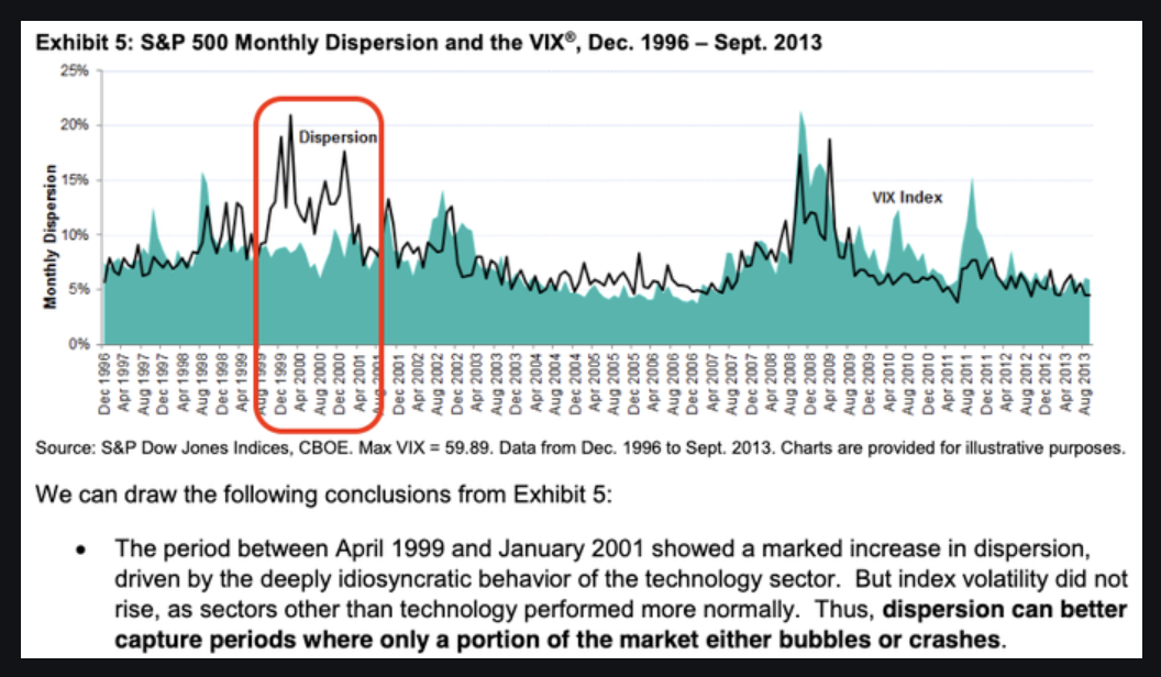 This bubble period is shown in the red box below, with dispersion in black and VIX (index vol) in green). We aren’t sure if there were nearer term examples of similar readings due to a lack of data from SPGlobal – but we suspect that a similar phenomenon occurred back in 2021.