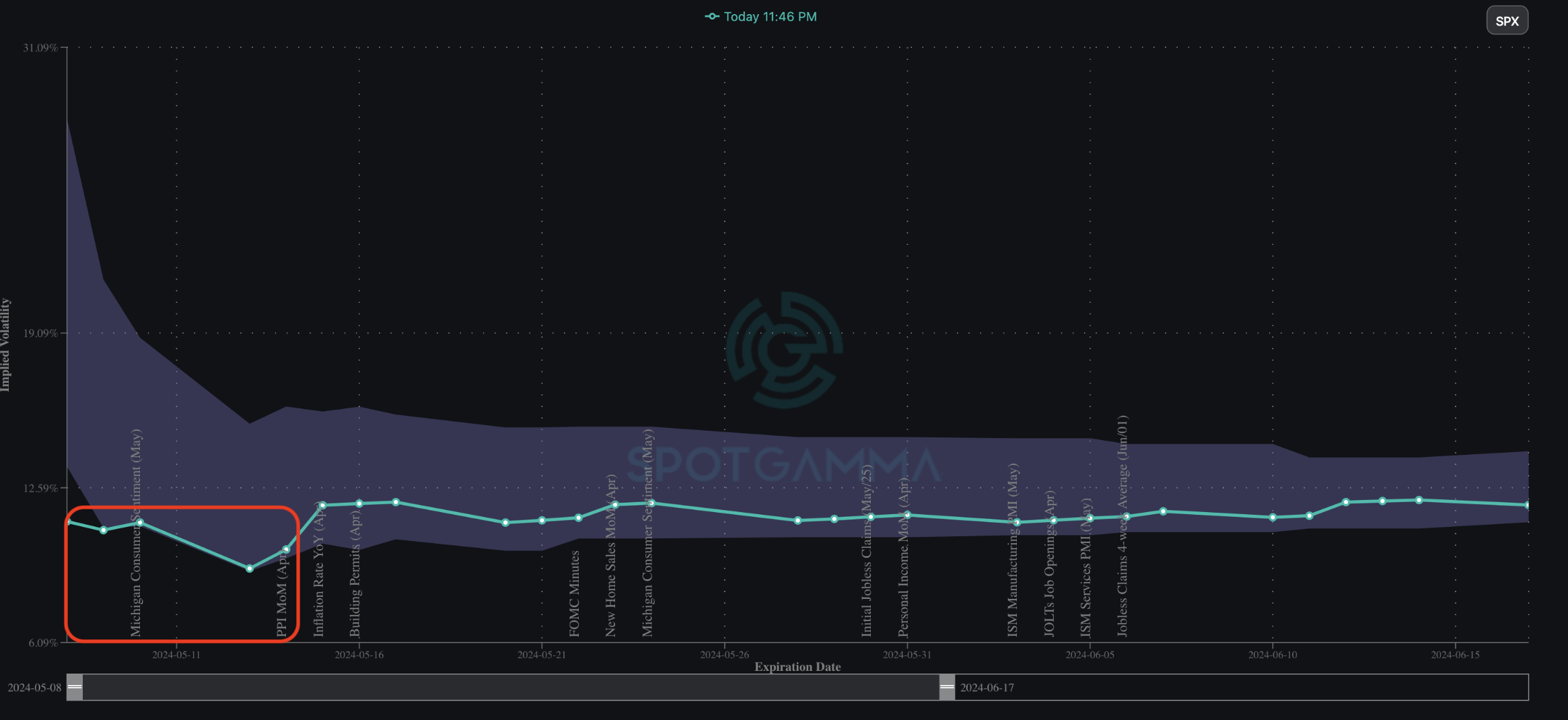 In this case, the target time frame for that happening is next week, and you can see above IV’s are mildly higher to the right of the red box. Next weeks IV’s are a bit higher for those given dates due to incoming data points, indicating traders are pricing in relatively higher IV for those dates. So, the issue here is that this relatively higher IV is anchored to the low realized vol we’ve been experiencing this week, as well as the lack of volatility hedging demand (i.e. SPX puts and VIX calls).