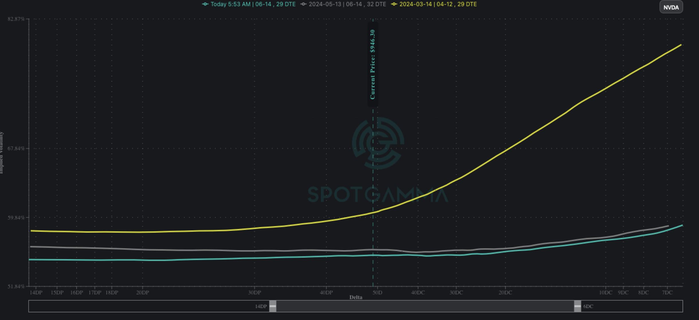 Turning to NVDA as the major catalyst, we recently discussed the lack of call skew heading into this ER (5/22) vs previous ER/events. The stock was up 3.5% yesterday, and its only ~3% from March all-time highs. However, the current 1-month skews (teal) show a much lower relative call skew than vs mid-March (yellow). This suggests that the options market is not “overbought” like it was heading into earnings. A lot can change over the next week, but should this situation remain we think its constructive for the stock, and therefore stocks writ-large.