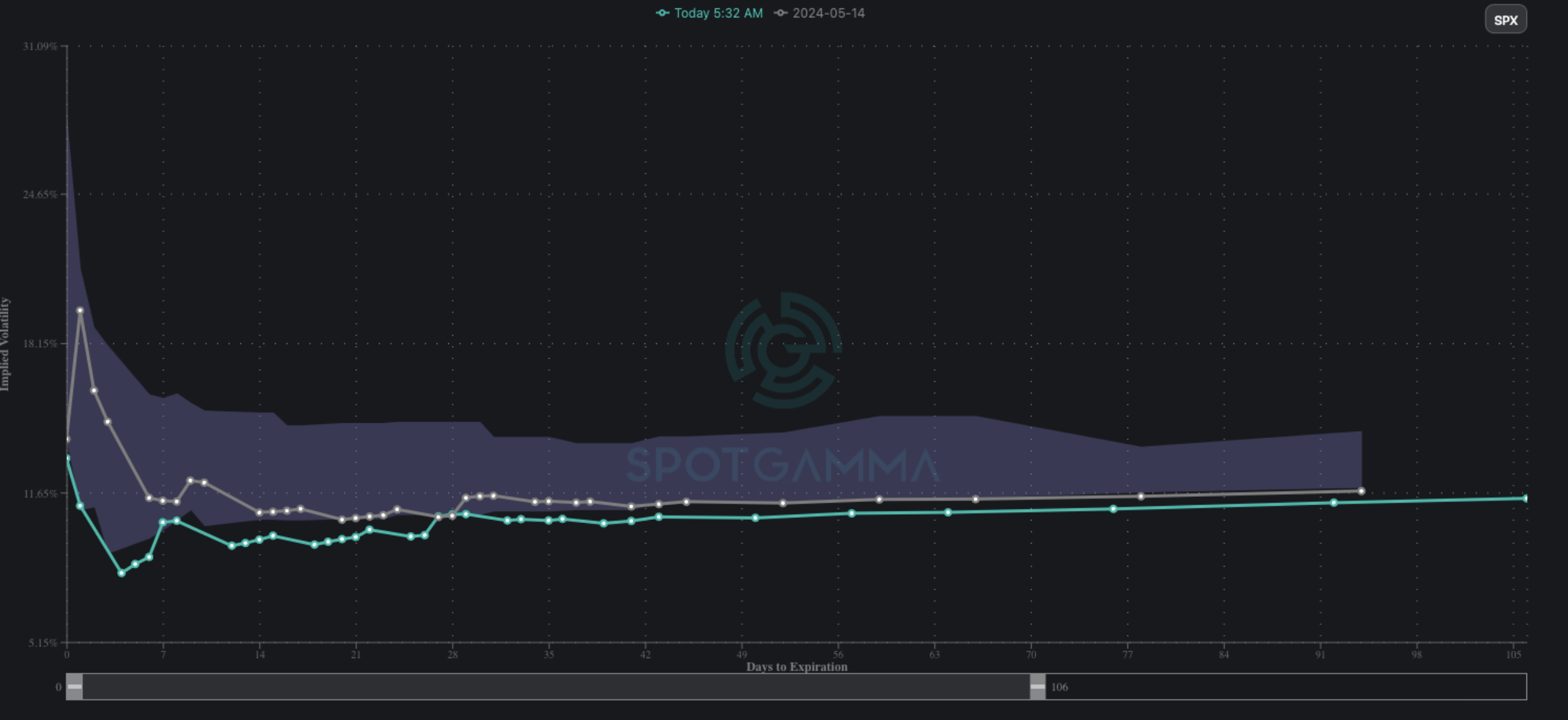 It was an absolute drilling across the SPX term structure, below. Here we compare the ATM IV from Tuesday night (gray line, pre-CPI) to this morning (teal), and as you can see, we are now at 90-day IV lows. With IV at major lows, there is little IV left to extract, which supports the idea of a pin. Vanna, at least as a catalyst for upside, is largely gone. Additionally, note that IV is de minimis out until the election, which is a signal that traders see very little risk over the next few months.
