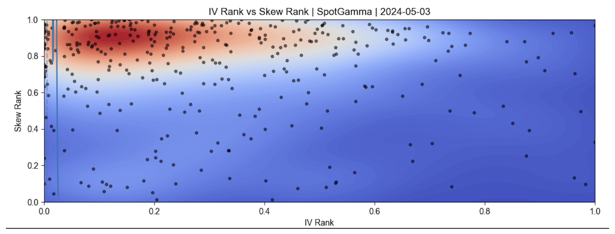 If we look more broadly at skews, we can see the red “blob” at the top left of this chart. This is starting to shift to “extreme” bullishness, as many stocks have increasing call IV’s relative to puts (i.e. skew, Y axis). IV Ranks are also sliding lower, which generally happens into bullish equity moves. A big NVDA number would likely shift us into extremes.