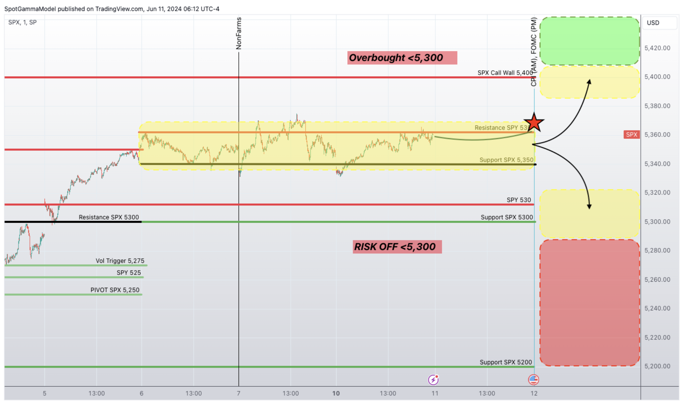 To the downside the major level is 5,300. We think that 5,300 is in play for today with a hot CPI number, and below that level our models flip to risk-off due to negative gamma.