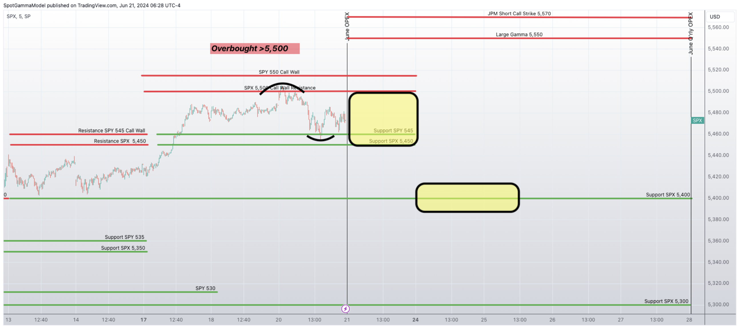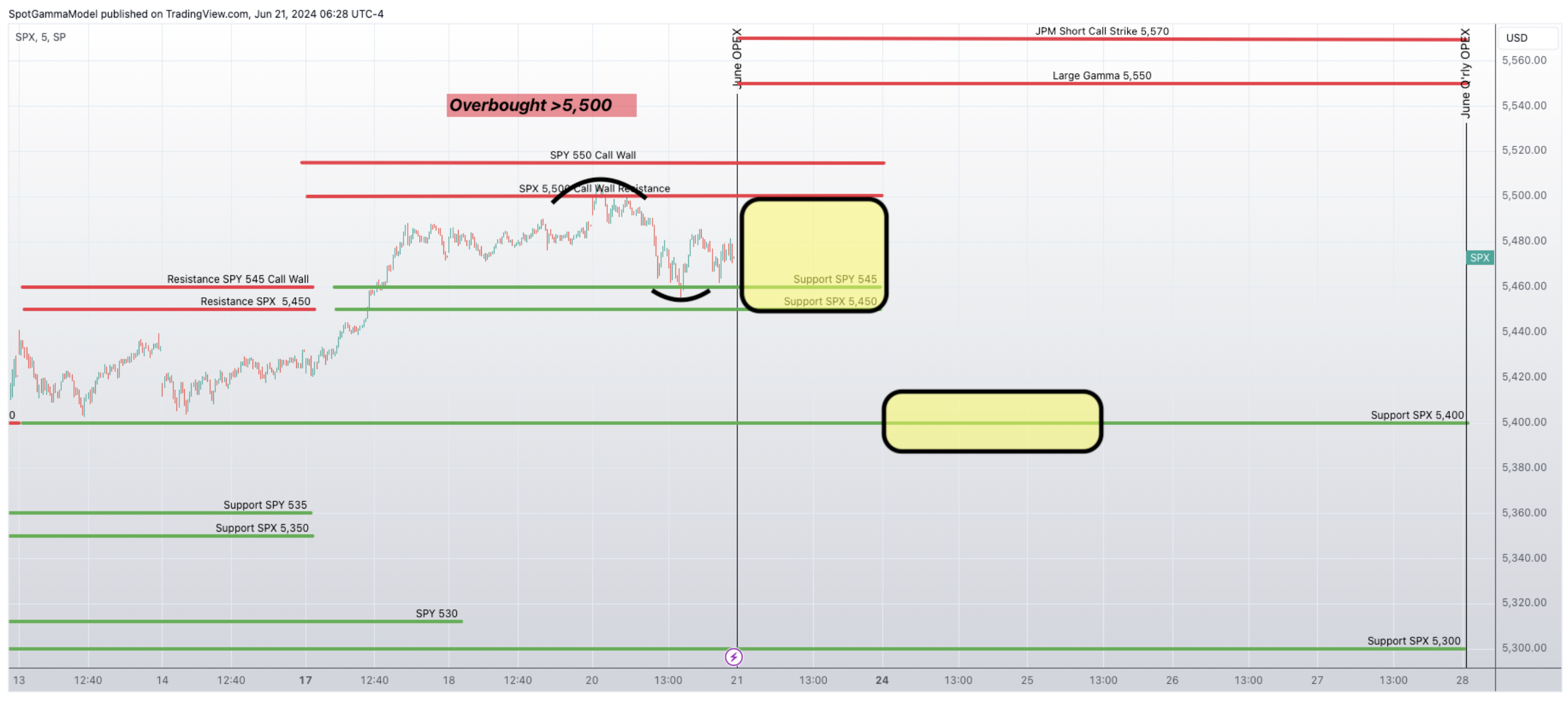 but that rejected into our OPEX window of weakness, leading to a test of the key SPY 545 support level (SPX 5,460). 5,500 – 5,510 remains major resistance for today, with the 5,460-5,450 range as support. A break <5,450 indicates a test of 5,400 for early next week.