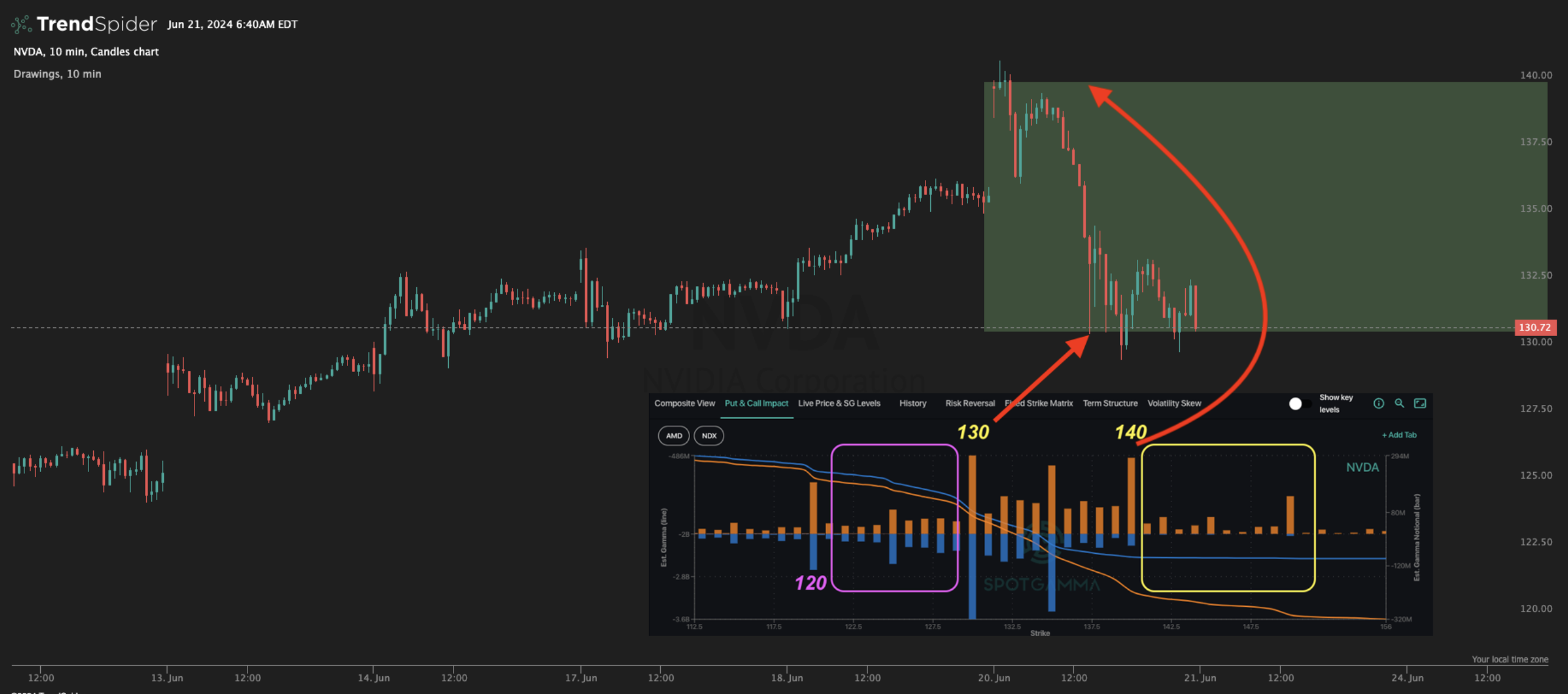 One of the topics most-discussed in markets today, is of the low correlation. This has been on display as single stocks, namely NVDA, blast higher in price, leaving broader equities in the dust. That “correlation move” was on display yesterday, just to the downside. NVDA yesterday rejected right at the 140 area highlighted in yesterday’s AM note, and lost 7% from that level to close at 130. In yesterday’s Member Q&A, we highlighted there were very few positions in NVDA <130, but today’s open interest update shows some large positions now at 120 – which is our new downside target.