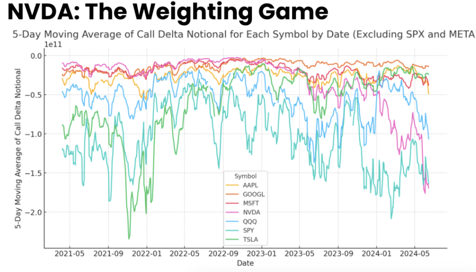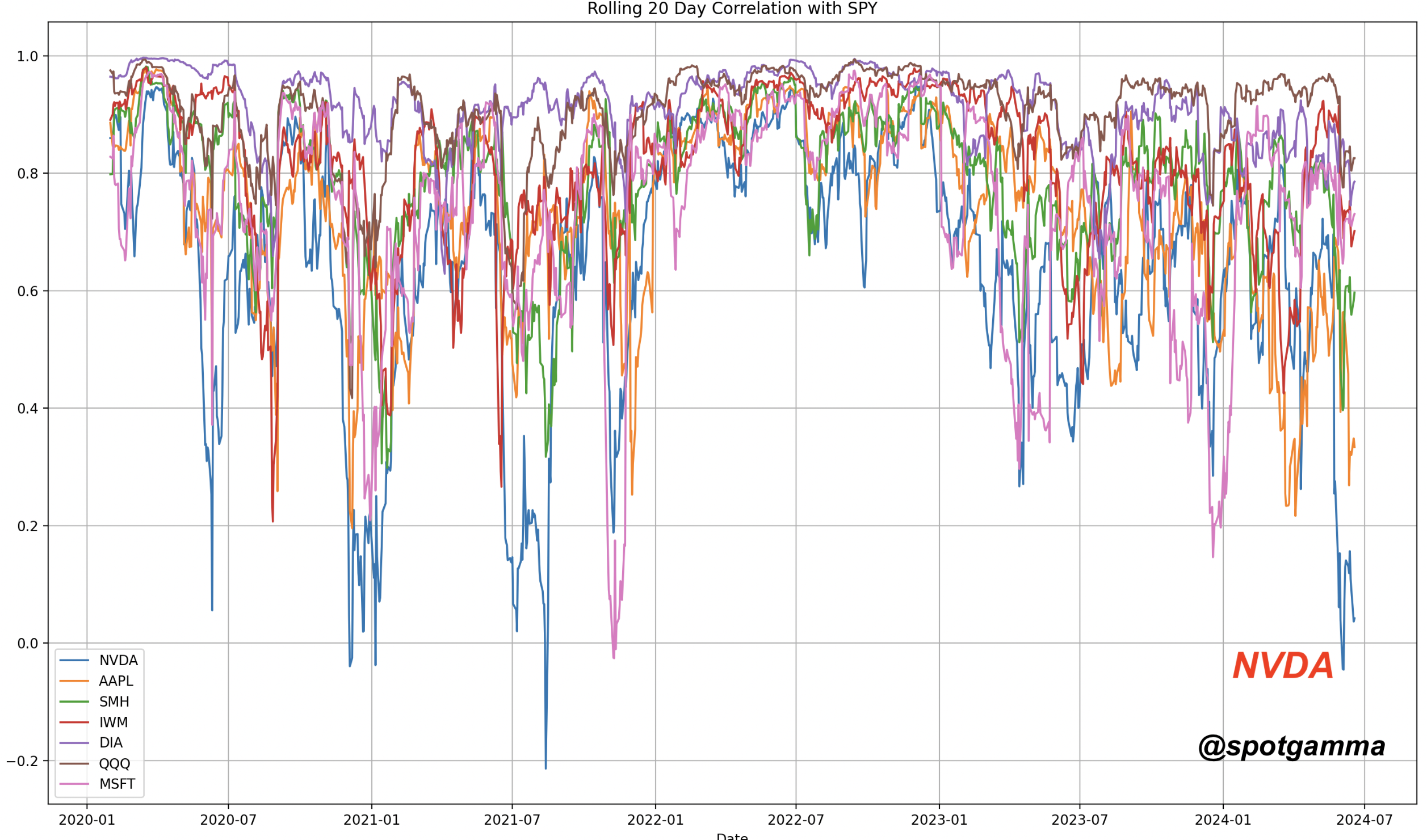 (pink) has eclipsed SPY (teal)? This implies to us that options are a driver in this extreme correlation, and through this line of thinking a large call expiration could serve to reign in that NVDA un-correlation.