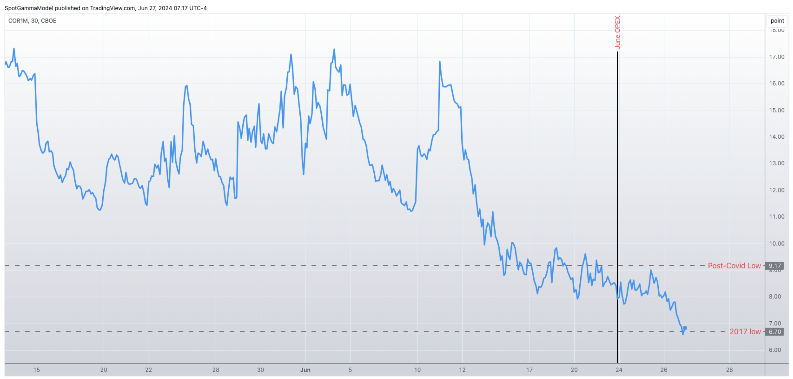 This has placed this 1-month correlation metric equal to 2017 lows! Again, these COR indexes are constructed using options implied vols from 1, 3 & 6 months ahead in time, so in a way they are forward looking.