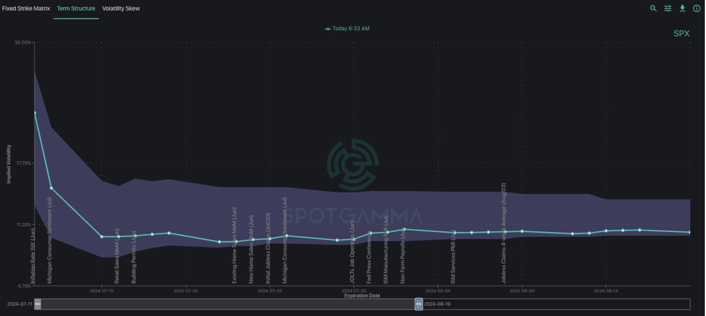 Turning to today, we see a mild lift in IV due to today’s CPI & Friday PPI. Longer dated IVs are at or near 90 day lows (bottom of gray shaded cone), and today’s 0DTE straddle is a bit elevated at $35, or 62bps with an IV of 22% (ref 5,630).