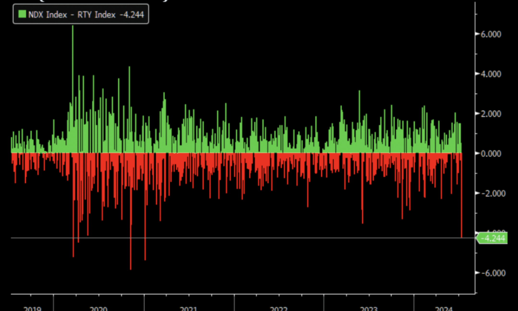 They key feature of yesterday’s equity movement was the biggest spread between small cap IWM vs Tech QQQ performance since Jan 6th, 2021 (h/t ZH), the the low CPI solidified a Fed rate cut. Odds of a Fed cut by September shot to 89% after the CPI.