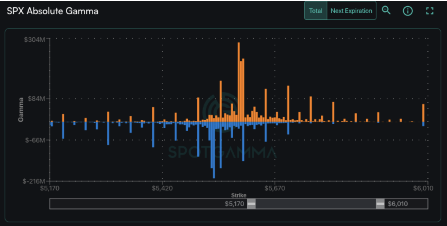 More specifically, what we see at SPX 5,600 is a cluster of big call positions (orange). This sets up as a call spread, with a trader short ~40k of the 5,590 strike, and long ~40k of the 5,595 strike. Further, there are ~10k long calls at 5,600 expiring today, too. This makes this a major upside target area for today.