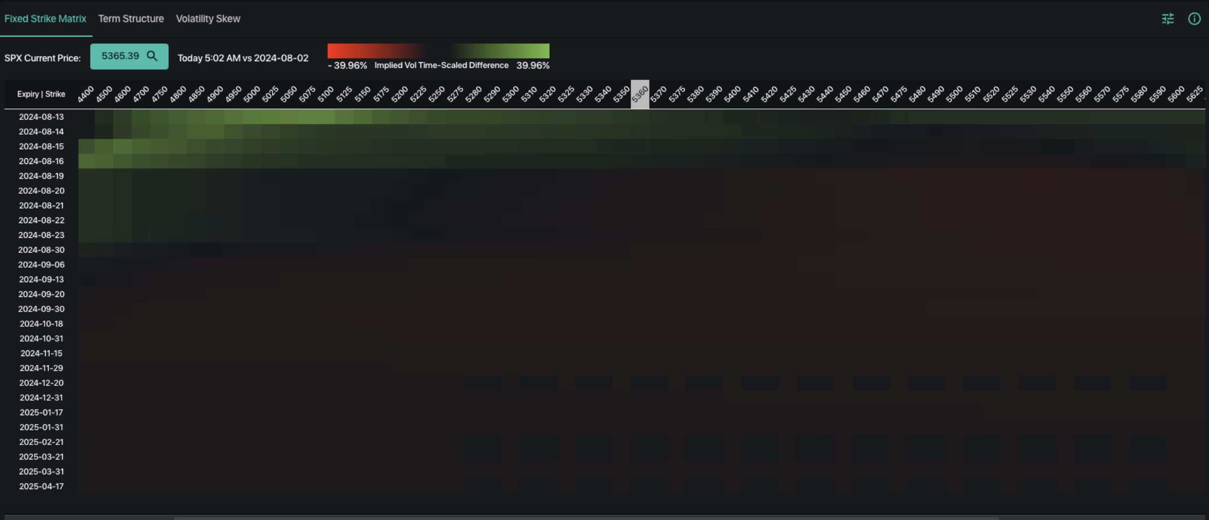 Reiterating that point, we present our SPX Fixed Strike Matrix below, which shows the change in SPX IV’s from Friday 8/2 to today. Looking at fixed strike vol here is interesting given that SPX prices are unchanged from 8/2, with our matrix accounting for the change in time, making this a fair comparison of IV’s between dates.