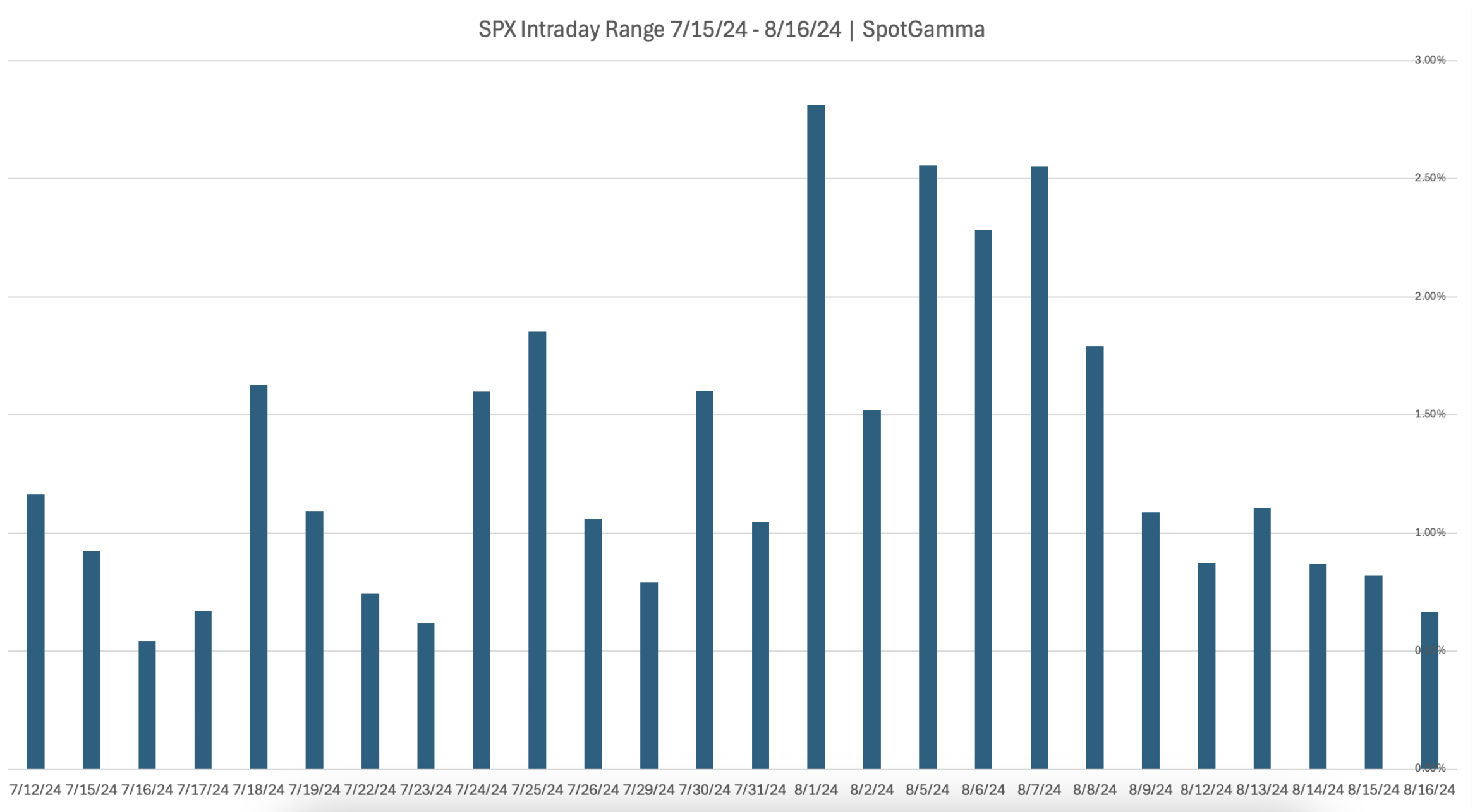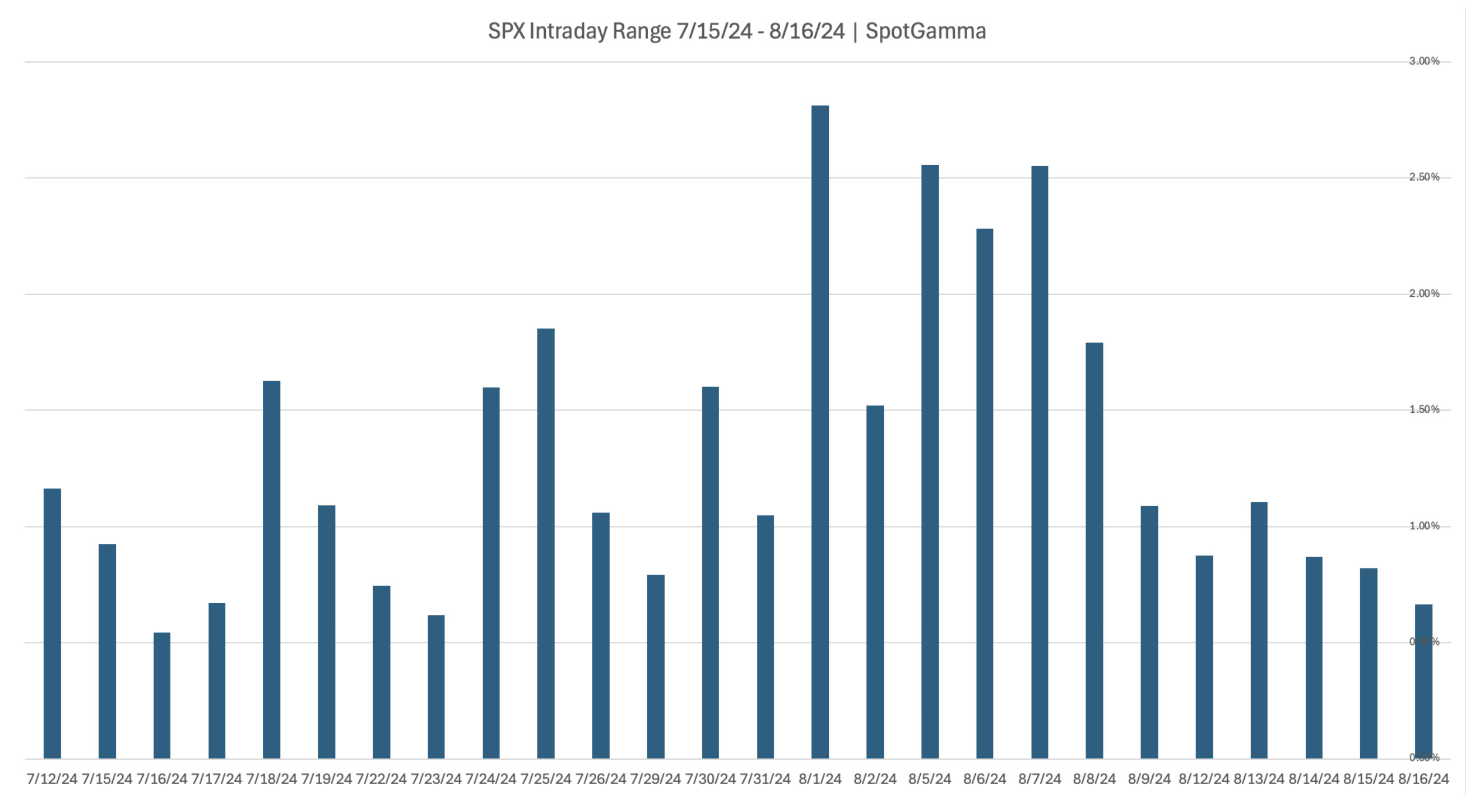 Friday’s OPEX removed the positive SPX gamma, which should allow for higher relative volatility. It was into Friday’s OPEX that volatility had finally started to subside after the violent drawdown and subsequent rally from earlier this month. This can be seen below in the daily intraday ranges over the past month.