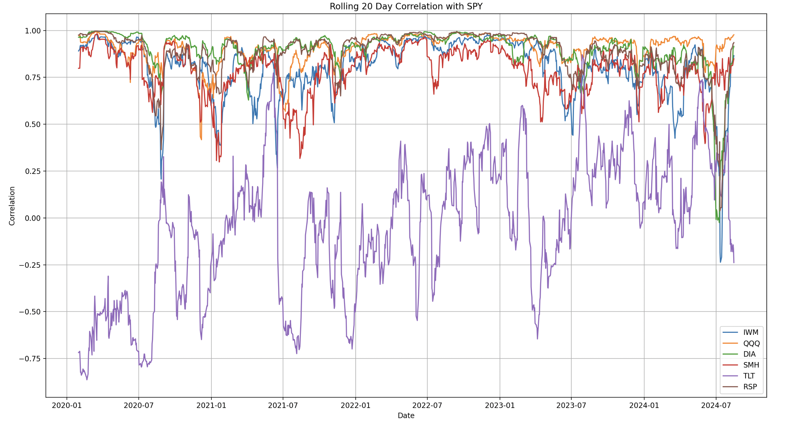 We also note that bonds, measured by TLT, returned toward a negatively correlated relationship which could continue to happen if rate cuts come with lower equity prices.