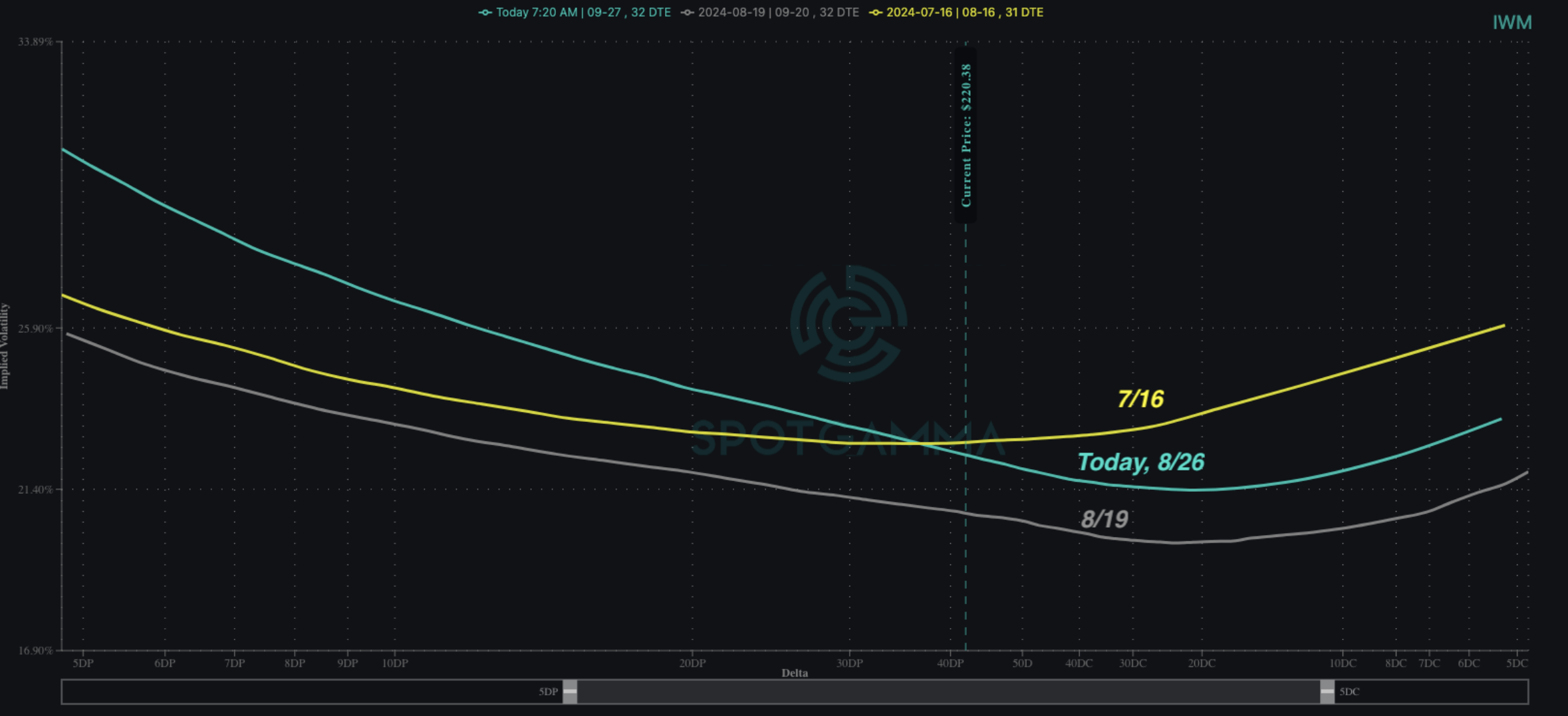 Below, you can see 1-month skew from last week (gray) vs today (teal). This actually shows a relative increase in downside IV (i.e. puts) has built up as IWM’s rallied 4% last week. You can also see that the shape of skew today looks nothing like the “small cap summer” fervor & raving call demand of mid-July (yellow), which noticeably pumped upside strike IV’s. If you recall back to this July period, we were flagging those very rich IWM call IV’s as a major headwind for more IWM upside. Here, things are not the same.