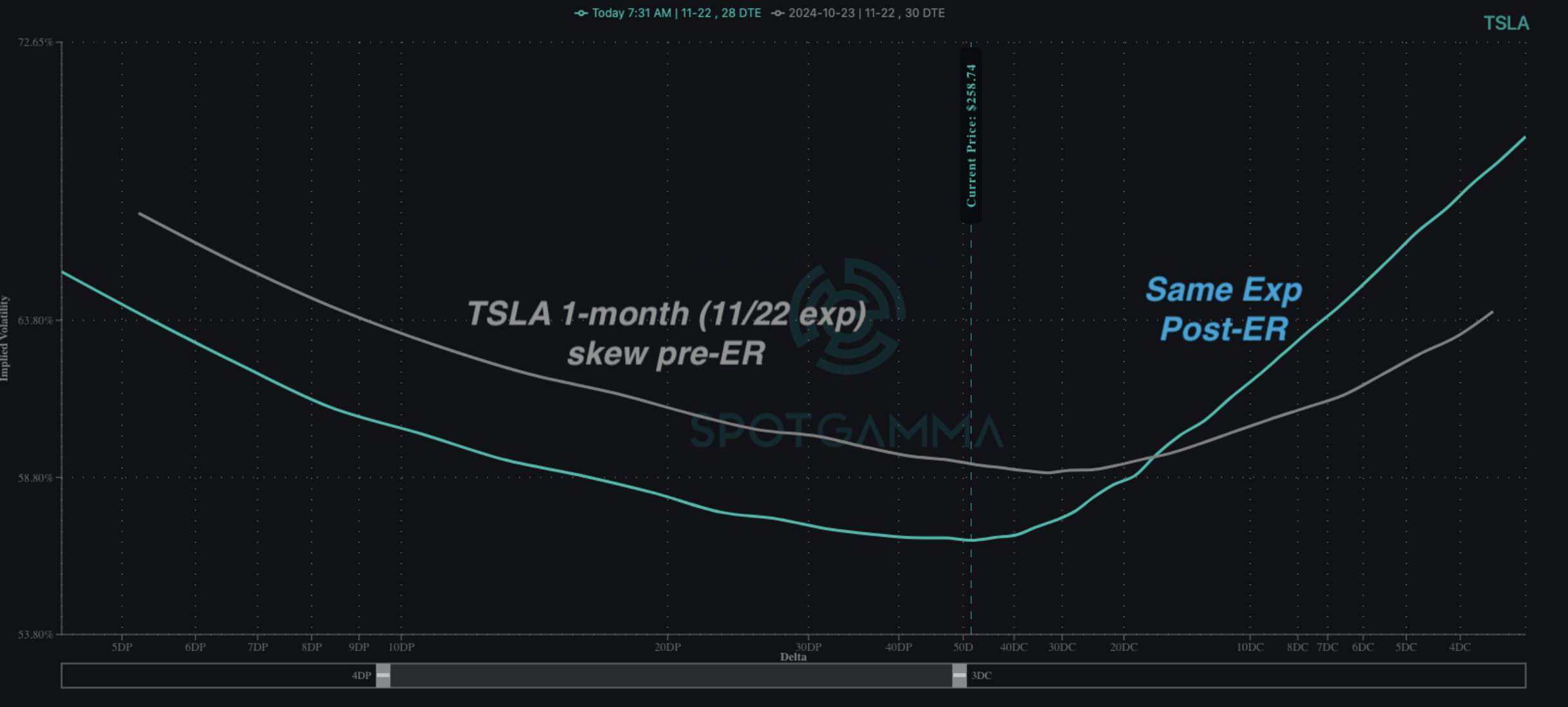 TSLA was up 20% yesterday, with a noticeable shift in call skew (11/22 exp below. Gray = Wed PM, teal = last night). The shift in call skew seems linked to new long call demand, more so than a short call cover into the TSLA rally. We state this as our data showed traders were already net long calls into earnings.