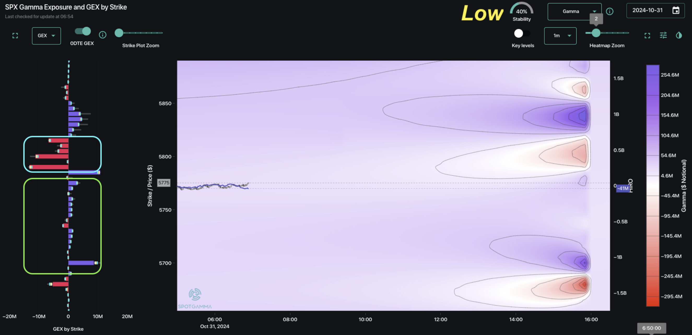 Using TRACE to set the stage, we can see that gamma remains mildly positive, but the Stability metric is a low 40%. This infers a fair amount of market movement today vs tight ranges from prior sessions.