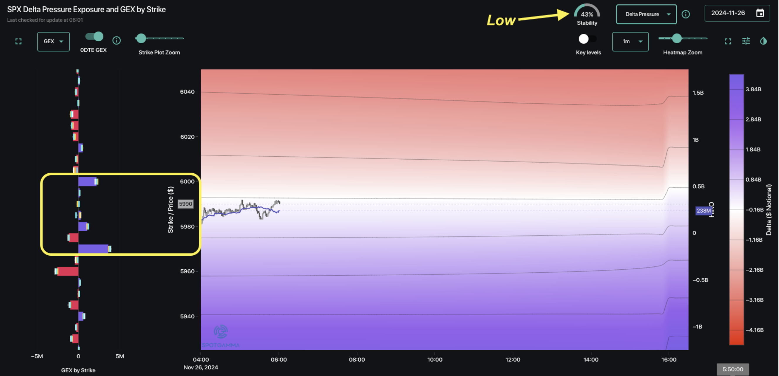 The SPX is pressing up against the large 6,000 strike, which should be a major area of attraction. While this implies equity stability, Trace distinctly reflects low stability this AM – as it did yesterday. We in particular note the zones >6,000 and <5,970 wherein there are small net negative gamma positions in play. Should the SPX feed into one of those two zones we would expect volatility to increase.