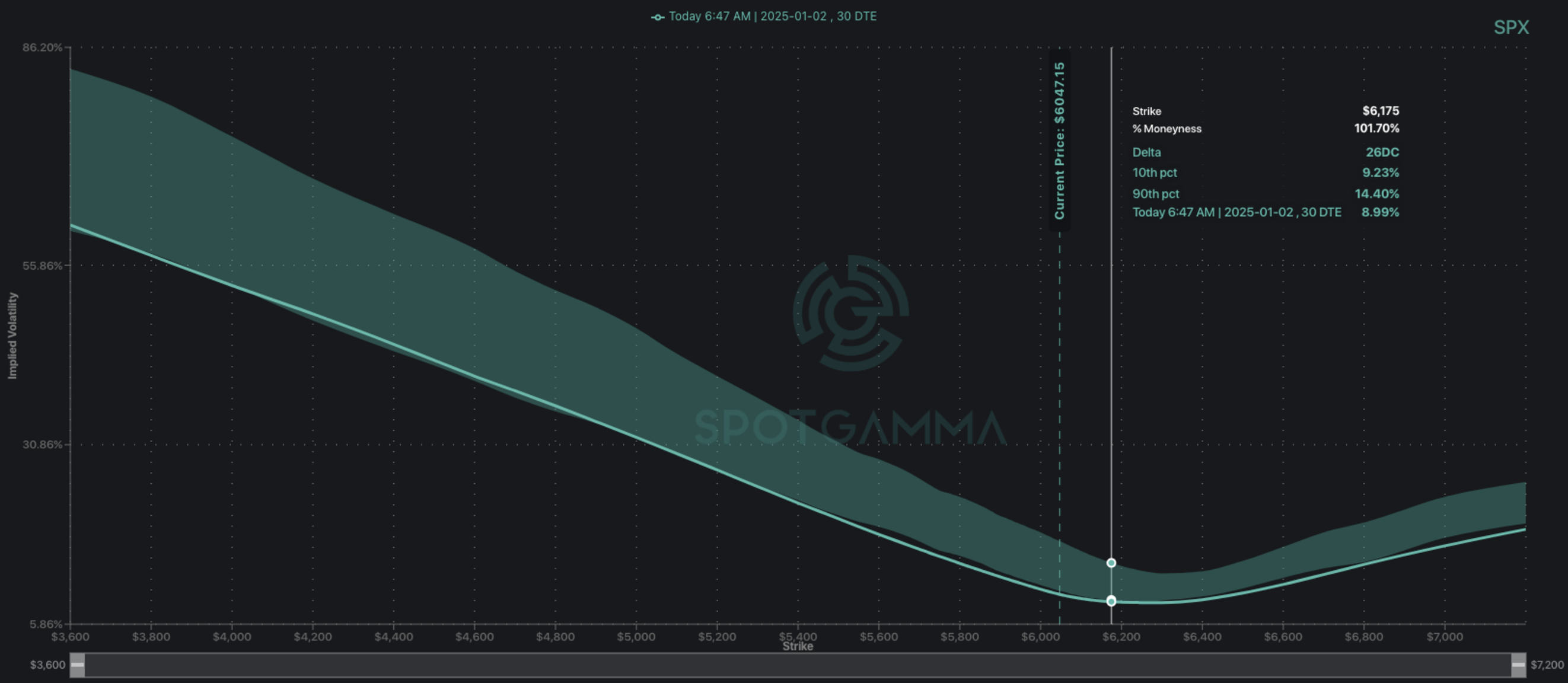 Some talk on FinTwit is around the low call implied vols for SPX which we discussed on Friday, and syncs with our Q&A discussion from yesterday AM about low single stock vols. Take for example the 1-month skew, below, which shows ~25 delta SPX calls (6,100 strike) trading <10% IV (quite low), which backs out to a ~45% chance of going in-the-money. That 6,100 level is <1% away from current SPX prices – which certainly seems achievable by year end (+1% in 30 days = ~12.8% IV).