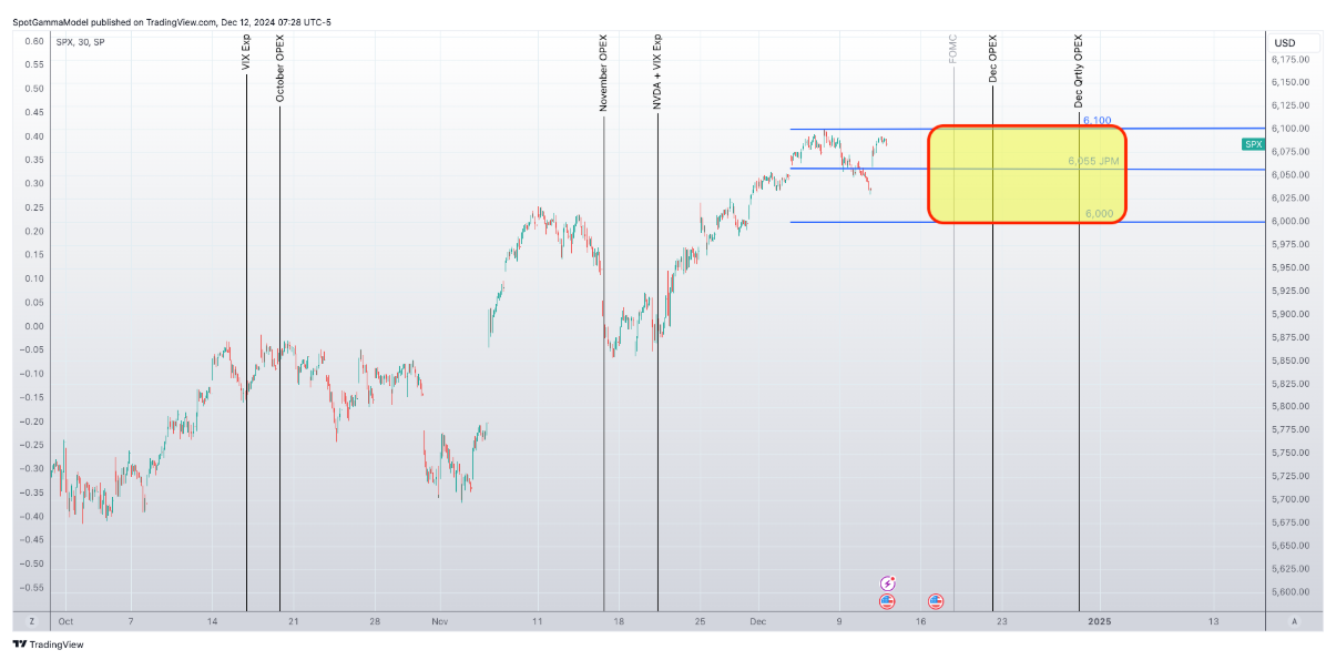 - Assuming the SPX is within 1% of 6,055 after 12/20 OPEX, we think SPX pins 6,055 into 12/31 Exp