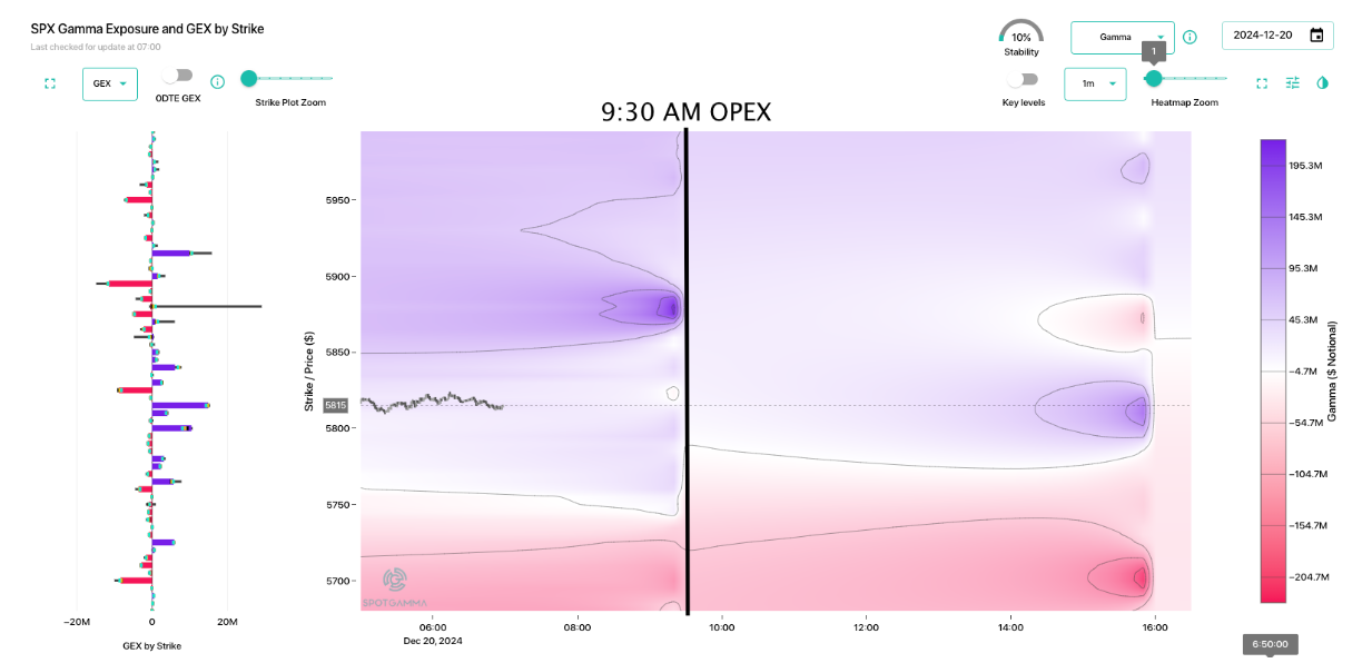 For SPX, this AM’s OPEX serves to remove positive gamma, which clears the way for further volatility. You can see this in the color changes from pre & post 9:30AM ET OPEX.