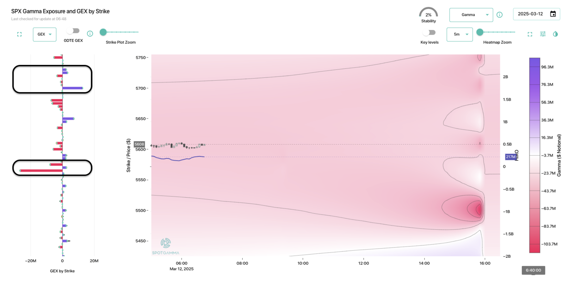 The big resistance area is setting up at 5,700 (with no major level before then), based on some positive gamma nodes near that strike.