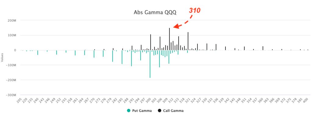 In tech, where we have been looking for consolidation, we noted heavy QQQ volumes centered around 310 strike. Of particular note was ~200k call volume at 310 & 311, and ~150k put volume at 308/309/310 strikes. We generally read heavy volume around large OI as traders finding “fair value”, and this 310 strike likely remains in play through a fairly large 3/31 expiration.