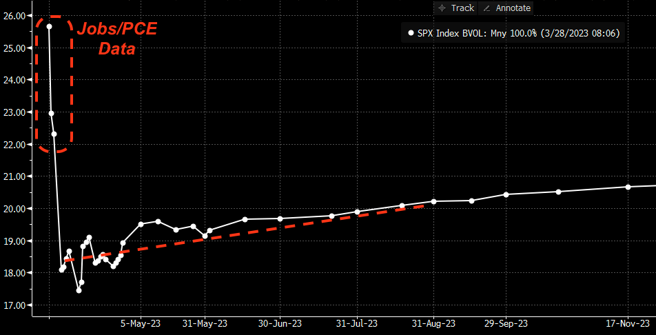 The market continues to exhale as the bank-related tail risks subside. We continue to see a reduction in short term IV’s which eases downside pressure. This lower IV can be seen via the contango in the SPX term structure, as shown below. Note IV is elevated around Thursday’s/Friday’s jobs/PCE print, but these IV’s are quite reduced versus recent, similar data points.